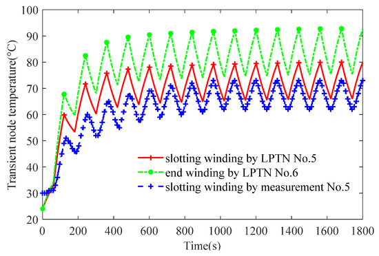 Rectangular wave loss of slotting winding and end winding is given in Figure 11. A rectangular periodic step torque from light load to heavy load is simulated, which leads to the change of winding loss (Aslo_win1 = 810 W, Aslo_win2 = 203 W, Aend_win1 = 651 W, Aend_win2 = 155 W). The thermal source matrix is updated at every time step and transient temperature curves of slotting winding and end winding are given in Figure 12. We can find that the calculation result of LPTN agrees well with the outcome of the experiment. For the slotting winding at the steady state, there is about an 8 °C error between the measurement value and the LPTN value. The reason for the higher value is that the value of thermal resistance or winding loss may be high for single node modeling.