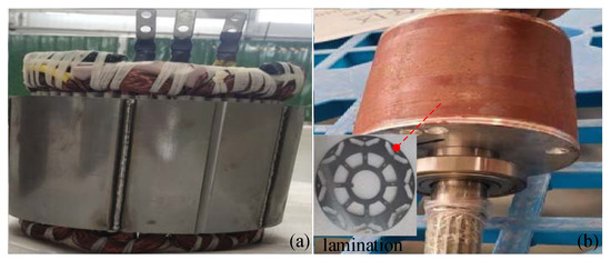 In order to verify the LPTN model, the prototype of 48-slot/8-pole IPMSM with “V” type rotor and ISDW stator is designed and manufactured. The stator and rotor are shown in Figure 13. A load test platform is established to validate its temperature rise and output characteristics, as shown in Figure 14.