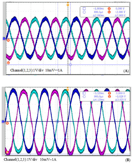 The measured phase current wave using three AC current clamps under rated load conditions is shown in Figure 15A, whose peak value reaches 232 A. The phase current under overload conditions is obtained in Figure 15B, whose peak value reaches 382 A.