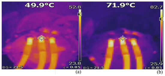 Infrared thermal image. (a) T = 119 N·m, n = 4000 rpm, Ia = 151 A, (b) T = 295 N·m, n = 2000 rpm, Ia = 351 A.