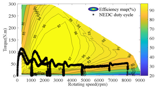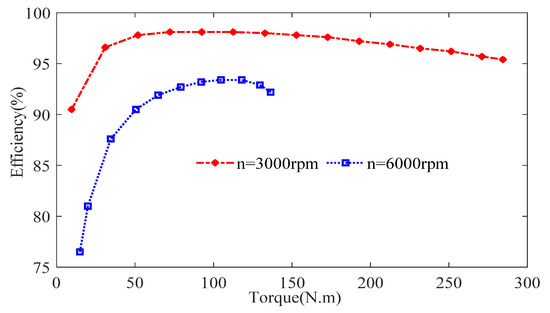 The measured IPMSM efficiency versus different load torques at 3000 rpm and 6000 rpm are given in Figure 17. We found that efficiency is higher at a rated speed of 3000 rpm. Due to a large copper loss and iron loss in the field-weakening region, efficiency is relatively low. A measured IPMSM efficiency map including constant torque and constant power operating regions is given in Figure 18. The operating point of the NEDC duty cycle is also obtained by the test platform as shown in Figure 18. We found that the maximum efficiency of IPMSM reaches about 97%; however, the relatively low efficiency in the constant power operation region ranges from 80% to 87% for the NEDC duty cycle.