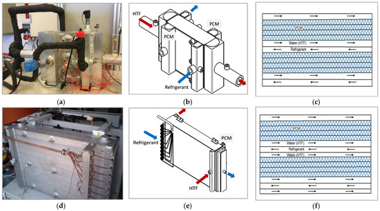 The two modules shown in Figure 2 were designed to contain PCM layers between the refrigerant and heat transfer fluid (HTF) channels. All channels and PCM layers contain aluminum fins to enhance the heat transfer process. In the PCM layers, dense offset-fins are used, with the ability to hold a large amount of PCM and with high mechanical stability able to withstand stresses from the volume changes of the PCM during phase change. Channel distribution is shown in Figure 2c,f for lab-scale and full-scale modules, respectively.