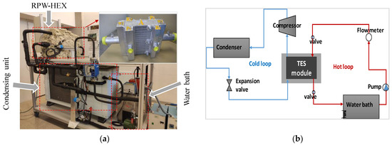 The experimental facility used for testing the lab-scale storage system was built at the laboratory of GREiA research group at the University of Lleida, in Spain (Figure 3). The test-rig consists of a refrigeration system, in which the storage system was installed as an evaporator, and a thermostatic bath working with water-glycol as the HTF, making two independent loops. The refrigerant loop that supplies cold to the TES module consists of a condensing unit (Zanotti model GCU2030ED01B) able to work at different operation powers, working with R449A refrigerant. The unit is made of a hermetic scroll compressor (CU E scroll digital), an electronic expansion valve, and an air-cooled condenser. According to the manufacturer, the condensing unit has a maximum cooling power of 4.956 kW with a coefficient of performance (COP) of 2.12 when operating at an evaporation temperature of −10 °C and ambient at 32 °C. However, the actual cooling power of the condensing unit can be varied by adjusting the compressor power rate down to 15% of its maximum. The HTF loop was built to ensure a stable inlet temperature into the module by incorporating two immersion electric heaters (OVAN TH100E-2kW and JP SELECTA-1kW) and two immersion chillers (JP SELECTA FRIGEDOR-285W) into a water bath. Moreover, the loop also contains a pump for HTF circulation and an advanced flow meter (Badger Meter Primo) with an accuracy of ±0.25%. For data acquisition, 13 temperature sensors (Pt-100 class B, IEC 60751 standard type) with an accuracy of ±0.3 °C were used, nine of them to measure the temperature evolution in the PCM, two of them at the inlet and outlet of the refrigerant loop, respectively, and the other two at the inlet and outlet of the HTF loop, respectively.