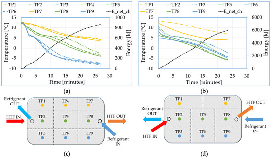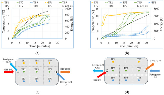 In terms of energy, Figure 7a,b also show the net energy recovered from the TES modules during the discharging process. In the time interval corresponding to an increase in the average temperature from −2 °C to 9 °C, the net energy recovered from the modules was 769 kJ in 20.0 min for the lab-scale module and 6227 kJ in 30.7 min for the full-scale module. The equivalent average discharging power () is 0.64 kW and 3.38 kW for the lab-scale and full-scale TES modules, respectively.