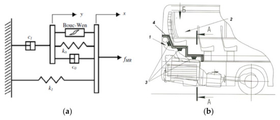 Mechanical model of MR damper (a), and general appearance of a bus soundproofing system (b).