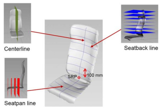 Based on dimensional differences, 12 bus seats were classified based on their features for the purpose of the study. Accordingly, lumbar supports were classified in reference to dimensional differences between extracted centerline and seat pan lines measured for the measured bus seat profiles. This means that the lumbar was shaped for ≥25 mm (mean) or flattened to achieve the lumbar shape of <25 mm on the center line, and the designed side lumbar support was shaped for ≥45 mm or flattened to achieve the side lumbar support shape <45 mm than the side lumbar support on the seat pan lines (Figure 4) [48].