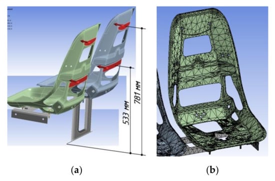 Seat model made of pressed sheet: (a) solid model; (b) Finite Element Method (FEM) model.