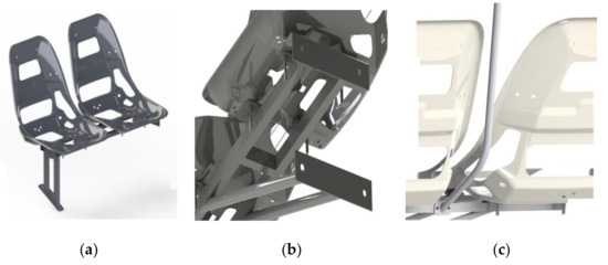 The study of three variants of the seats loaded with the following scenarios was carried out: with a stand (Figure 6a), with a side fixing console (Figure 6b), and with an additional handrail, which was attached to the roof frame (Figure 6c).