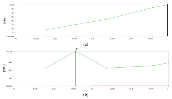 Starting from the fact that the second scenario (Figure 6b) is characterized by higher optimization potential, in comparison with the classical variant (Figure 6a) with a stable floor mount, which has a much smaller distance between the mount supports, and therefore a significantly greater moment of action from the forces, it is advisable to strengthen it by the introducing an additional rail attached to the roof frame (Figure 6c). It is worth noting that it is often possible to find a construction variant with a handrail attached to the frame of one of the seats. Thus, as a result of loads following UNECE Regulation No. 80, different values of displacement and absorbed energy are obtained for the back and the right-sided seats.