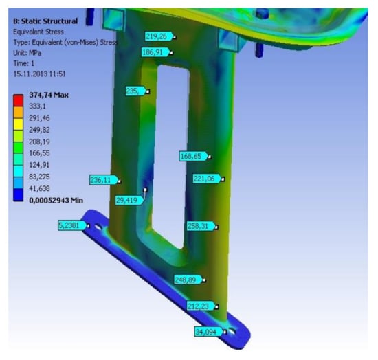 When considering the stress–strain state of the design at the stage of full absorption of the impact energy presented in Figure 7, the maximum stress value, equal to 374.74 MPa, is recorded in the frame of the right-hand drive of the bus in the area of the seat bend. This is as expected due to the greatest bending moments passing through this area. The stress values in the rack vary from 5 MPa in the flange with an increase of 45 MPa in the bolted joints and up to 270 MPa in the rack (Figure 8). Structurally, the seat leg is a welded structure consisting of a pressed sheet with a thickness of 2 mm and a flat flange fastened to the floor with a thickness of 3 mm.