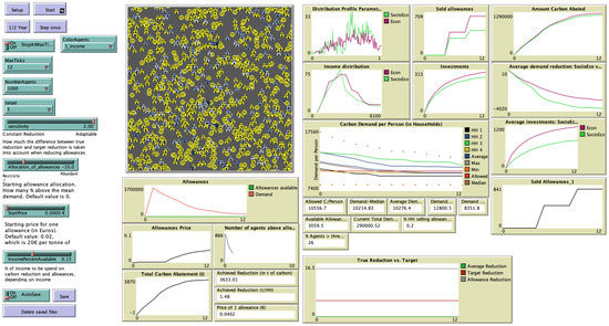 Figure 1) for the user to track the ongoing simulation at runtime. First, the ‘View’ depicts the generated households, symbolized as houses with different colors. Currently, there are three different shadings implemented: blue colors according to income, green according to the degree of socio-ecological motivation, and orange according to the number of household members. The model also provides certain real-time figures of average household emissions reductions, maximum and minimum reductions, percentage of households selling, etc.