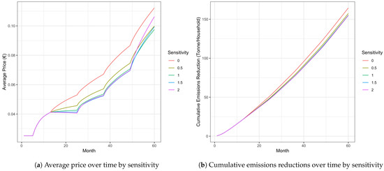 Figure 2a shows how the average price for allowances increases over time, depending on the sensitivity chosen at the simulation start. Clearly, sensitivity decreases the price of allowances in each month. Moreover, prices increase at the beginning of every 12-month period, as this is when policymakers adjust the allocation of allowances in accordance with their emissions reductions targets.