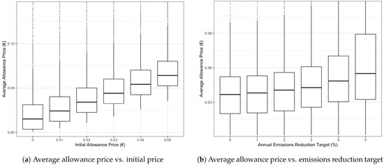 Figure 4a illustrates that the average price for allowances is influenced by the initial price. The higher the initial price for allowances, the higher the price over time. Moreover,