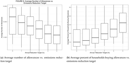 Figure 5a, one can see how an increasing reduction target decreases the average number of available allowances. Of course, with a higher reduction target, the annual allocation of allowances is lower and thus households are placed under more pressure to reduce their emissions. This can be seen in