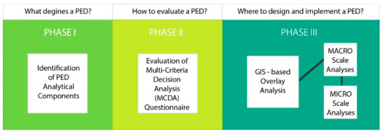 The methodology proposed in this paper for defining PED concept boundaries consists of three phases that synthesize the spatial information system of the cities together with technical, economic, social, environmental, political, and legal frameworks within their context. The phases of the methodology are summarized in Figure 1.