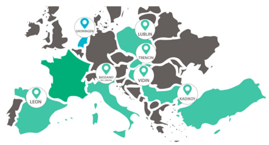 The methodology defined to select the areas to reach an annual positive non-renewable energy balance has been tested in six European cities: Bassano del Grappa (Italy), Kadiköy (Turkey), León (Spain), Lublin (Poland), Trenčín (Slovakia), and Vidin (Bulgaria) (Figure 2) [26].