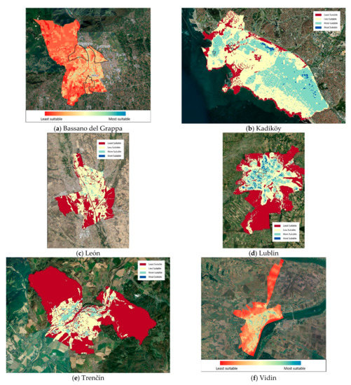 Weighted overlay result for cities displaying suitable areas for PED implementations. (a) Bassano del Grappa most to least suitable areas; (b) Kadikoy most to least suitable areas; (c) León most to least suitable areas; (d) Lublin most to least suitable areas; (e) Trenčín most to least suitable areas; (f) Vidin most to least suitable areas.