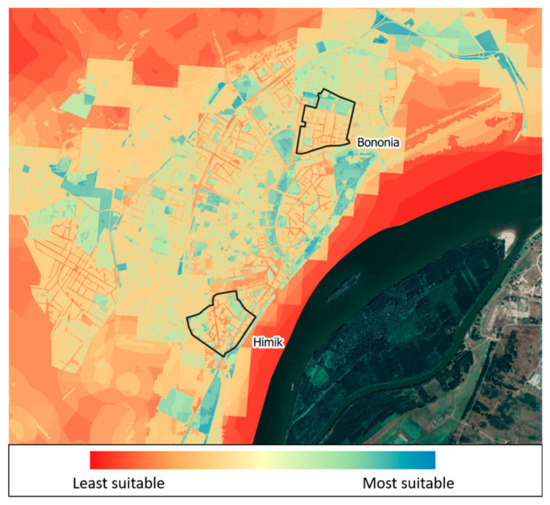 Before the analysis, municipality representatives of each city preselected districts of interest to become positive. The criteria followed to make this selection was variable from city to city since the PED concept was not defined properly at that time. For example, Vidin selected two districts, Bononia and Himik, that have a concentration of both public buildings (mainly schools and kindergartens) and residential buildings, while Leon selected a degraded area that needs strong investment. Figure 4 provides details of Vidin’s preselected districts by municipality overlayed with the results of candidate areas according to the Multicriteria and GIS analysis.