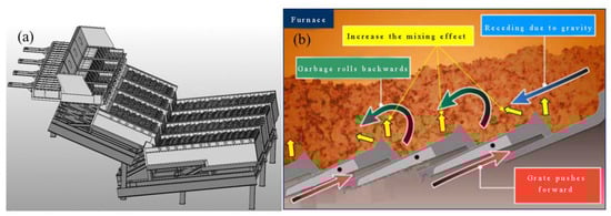 At present, the common grates mainly include Mitsubishi-Martin type, Keppel Seghers type, Hitachi Shipbuilding type and so on. In order to realize the effective treatment of existing urban domestic garbage and the building of a “waste-free city”, a new type of “V-type “ grate has appeared. Compared with the traditional Martin-type reverse push grate, the grate structure adopts a special V-shaped layout, as shown in Figure 1a. The V-type grate combines the action of inverse tilt forward push and inverse tilt gravity, so as to achieve good tumbling and mixing. As shown in Figure 1b, due to the structural characteristics of the V-type grate, the materials burn more fully, the heat loss of chemical incomplete combustion and mechanical incomplete combustion is reduced, and the thermal efficiency of the boiler is improved. The adaptability of the incinerator to the incoming materials has also been strengthened, which is conducive to the uniform and stable incineration of multi-source organic solid waste. The internal gas recirculation system (IGRS) is the latest low air ratio combustion technology used in waste-to-energy projects. Flue gas with a higher oxygen content is extracted from the combustion zone and blown as secondary air to the secondary combustion zone, which brings the advantages of energy saving, high efficiency and reduced pollutant emissions.