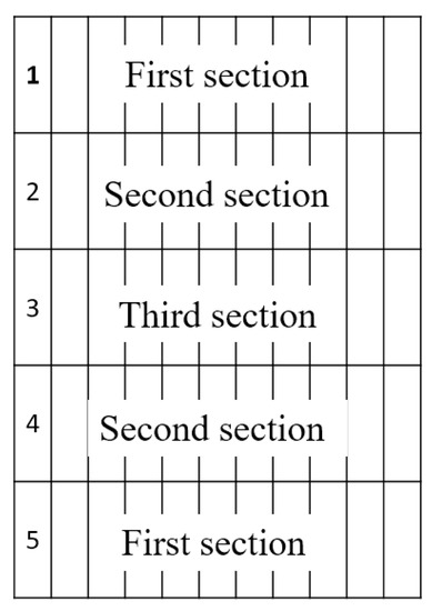 The simulation of the waste incineration process was divided into two parts: the simulation of the combustion of the solid phase in the bed and the simulation of the combustion of the gas phase in the incinerator [15]. The gas-phase temperature, concentration, and velocity of each component at the top of the bed were calculated using FLIC. FLIC was a simulation software for bed combustion reactions, which were mainly used for the simulation of laminar combustion of fuels with high moisture and high volatile matter such as biomass and waste. Fluent software can simulate flow, heat transfer and some chemical reactions. Users can adjust the parameters during setting according to specific requirements to make the simulation more in line with actual working conditions. The FLIC simulation results were imported into Fluent and used as the inlet boundary conditions for the gas-phase combustion simulation [16]. Then, the radiation flux of the bed was imported to the FLIC as the radiation boundary. The two processes were repeated until the results converged [17,18]. The solid-phase combustion reaction in the bed was simulated by using the FLIC software [19,20]. Owing to the non-uniformity of the grate’s radiation intensity distribution, the grate was divided into eleven and five sections along the length and width, respectively. The corresponding radiation intensity was input into the FLIC. The radiation intensity distribution along the grate width was symmetrical, and only the solid-phase combustion of the wastes in the first, second, and third sections was evaluated. The bed segmentation process is shown in Figure 2. The non-uniformity distribution of the waste composition was ignored.