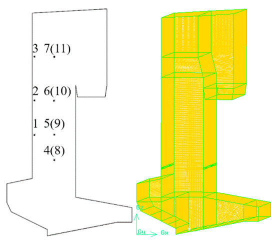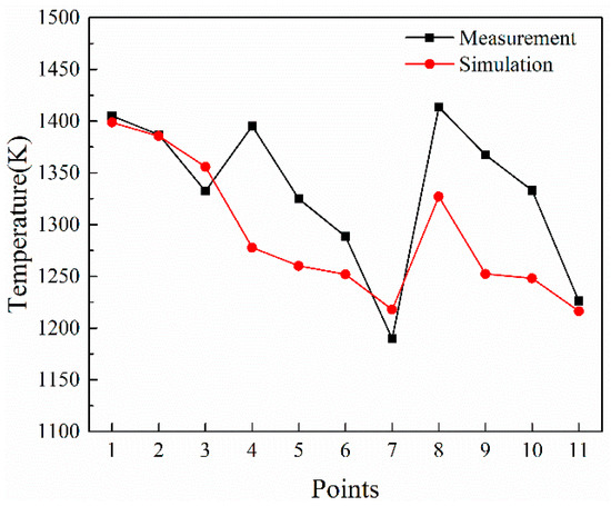 To verify the reliability of the model, a comparison between the simulated and measured temperatures of the 11 points of the first flue, as depicted in Figure 3, was presented in Figure 5. It can be seen that the simulated temperature was in good agreement with the measured temperature, with a relative error of less than 10%. Therefore, the employed model was reliable and can reasonably simulate the combustion of MSW.