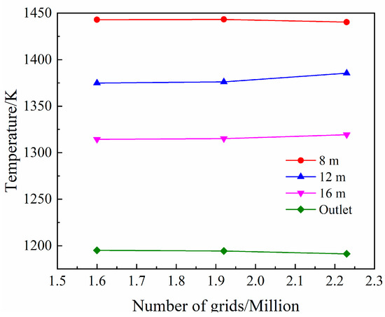 This grid independence test simulation uses three groups of grids with 1.6 million, 1.92 million and 2.23 million grids, respectively. Figure 4 shows the variation curve of the average temperature of different height sections of the furnace chamber with the number of grids. From the figure, it can be seen that the temperature deviation of the three sets of grids was small, and so it can be considered that the numerical simulation results were independent of the number of grids. Therefore, considering the requirements of calculation accuracy and calculation time, we finally chose 1.92 million grids for calculation.