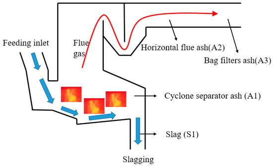 MSW and ash were obtained from a waste incineration plant in Hubei province, China. Table 1 lists the results of the proximate and ultimate analyses (on an as received basis) of the MSW. Samples of cyclone separator ash, horizontal flue ash, bag filter ash, and slag (No. A1, A2, A3, and S1) were collected every 2 h on the same day. A schematic diagram of the sampling location was shown in Figure 6. The particle size distribution of the fly ash was analyzed by using a laser particle size analyzer. A scanning electron microscope (SEM) was used to analyze the microstructures of the fly ash and slag. X-ray fluorescence spectrometry (XRF) and X-ray diffraction (XRD) were used to analyze the components of the fly ash and slag. Figure 6 shows the sampling locations.