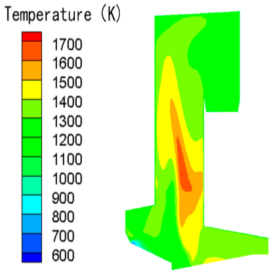 Figure 7 shows the temperature distribution on the middle plane of the incinerator obtained through the simulation calculation. Since a large amount of secondary air is shot from the middle of the furnace, providing sufficient O2, the combustible components appear in the middle of the furnace for secondary combustion, which is the main reason for the higher temperature in the middle and upper part of the furnace, with the highest temperature reaching 1650 K. In addition, the flue gas flows and mixes in the upper part of the incinerator. The flue gas then flows and mixes in the upper part of the furnace chamber and transfers heat to the water wall, so the flue gas temperature gradually decreases and tends to be uniform. Compared with Ref. [10], it was found that because the temperature of the primary air and the secondary air were lower than the temperature in the literature, the resulting maximum flame temperature was also lower, which is consistent with the general trend in the literature.