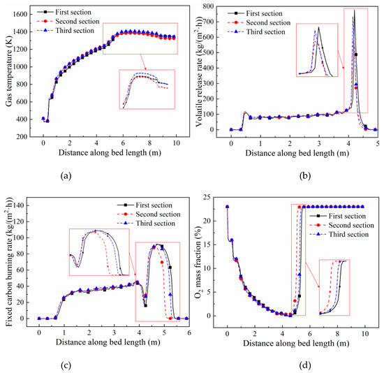 To provide a deeper insight, Figure 8 shows the simulated results of the combustion parameters along the bed length. At 0.38 m in the bed length direction, the gas temperature rose sharply because the volatile components started to precipitate and burn due to the joint radiative heating effect of the primary air and the furnace flue gas. The release rate of volatiles reached a peak at 4.15 m. After that, the gas temperature above the bed decreased due to the incomplete combustion caused by the large amount of volatiles precipitating and absorbing heat, as well as the decrease in oxygen concentration. After 4.6 m, the volatiles were almost completely precipitated. After 0.6 m, the fixed carbon started to burn, and with the increase of flue gas temperature, the burning rate of fixed carbon increased. By 4.15 m or so, the burning rate of coke slowed down, and after 4.2 m, the burning rate of fixed carbon increased significantly due to the violent burning bed temperature of volatile fraction. After the volatile fraction is completely precipitated, the gas temperature above the bed continued to rise under the effect of coke combustion, and the highest gas temperature above the bed reached 1450 K. After 5.67 m, the fixed carbon was basically burned completely, and the gas temperature above the bed gradually decreased with the burning of fixed carbon. As illustrated in Figure 6, the volatile release, fixed carbon combustion, and oxygen consumption in the first and third sections were almost the same. In comparison, the release of volatiles and the combustion of fixed carbon in the second section were completed earlier. In addition, the maximum burning rate of fixed carbon and the maximum release rate of volatile in the second part were lower than the other two parts, so the temperature of the second part was slightly lower.