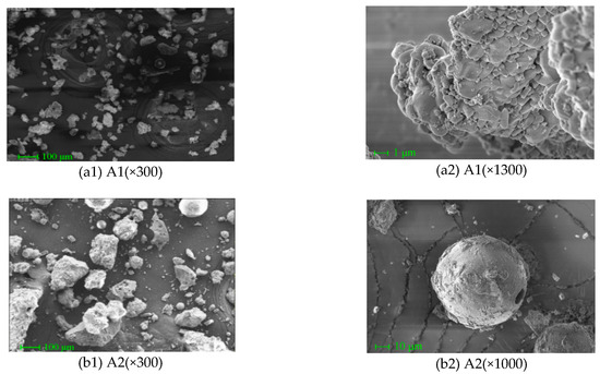 Figure 9 shows the particle size distribution of the fly ash. The particle size range of the three types of fly ash was 0.01–1000 μm. Particle sizes less than 0.2 μm in A1 were almost zero, and the main particle size range was 15.8–100.2 μm. In A2, fly ash particles with a size of less than 148.3 μm accounted for 50% of the distribution, and fly ash particles with a size of less than 391.6 μm accounted for 90%. Particles smaller than 37.586 μm accounted for 50% of A3, with the main particle sizes ranging from 22.440 μm to 89.337 μm. Sample A3 is the fly ash collected from the last-stage bag filters. A comparison between the results of samples A2 and A3 shows that large-size ash particles were effectively captured by the bag filter.