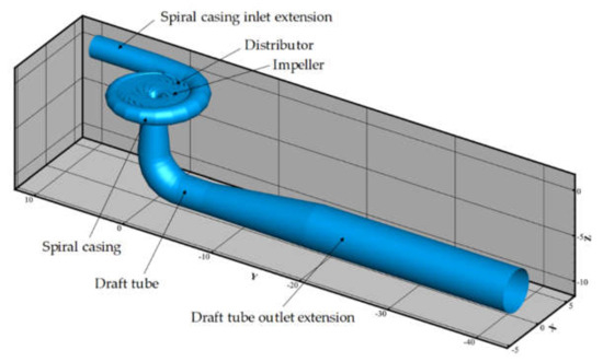 The computational domain corresponds to the full water passage of the pump turbine on a prototype scale, which consists of spiral casing inlet extension, spiral casing, stay vanes, guide vanes, impeller, draft tube and draft tube outlet extension (Figure 1). The basic parameters of the project and geometry are listed in Table 1. The guide vanes were set to the rated guide vane opening as indicated in Table 1.