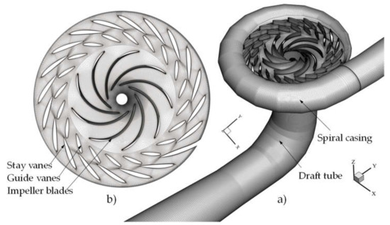 A set of completely block-structured hexahedral meshes were applied to the whole computation domain. The inlet pipe and spiral casing, stay vane and draft tube were meshed, respectively, with ANSYS-ICEM as a whole. The mesh for the stay vane was generated with a topology similar to that for the guide vanes in ANSYS-TurboGrid. The meshes for the guide vanes and impeller were generated with ANSYS-TurboGrid and assembled as a whole. The previously mentioned components were connected together through the interfaces. Figure 2a,b shows the general view of the meshes, particularly for the distributor channels and impeller, respectively. A mesh convergence test was conducted, and it was found that the total amount of nodes of the final whole mesh was 11,437,464 due to the limit of the affordable computing source. The mesh statistics for each component are summarized in Table 2.