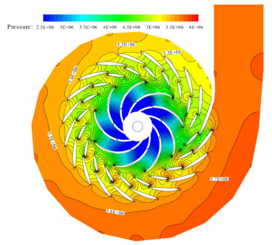 Contour of pressure at the unit centerline elevation of the pump turbine (a0 = 1200 m/s).