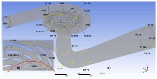 In order to study the behavior of the pressure waves caused by blade passage inside the stationary components, 110 points in total, as shown in Figure 4a, were set to monitor the absolute pressure and density in the stationary components, such as spiral casing, distributor channels and draft tube. In spiral casing, the monitoring points were located along the centerline, starting from the end of the spiral casing (marked with SP00) and ending at the inlet of the spiral casing (marked with SP21). The accumulated length between monitoring points SP00 and SP21, which represent the circumferential length of the spiral casing for the geometry under investigation, was equal to 25.2 m. In the distributor channels, there were 4 sets of monitoring points located at its 4 quadrants (indicated with “E”,” N”, “W” and “S”, respectively) and starting from the impeller leading edge (marked with VL_*01) up to the inlet of the stay vanes (marked with VL_*14); see Figure 4b for the monitoring points located inside the distributor channel close to the nose vane. Except for the monitor location control of VL_*01, VL_*02 and VL_*03, which were inside the impeller rotating domain with the local frame type, all the other monitoring points were inside the stationary domain without specification of the monitor location control. Inside the draft tube, there were also 4 sets of monitoring points, where “I” indicated at the inner side of the elbow, “O” indicated the outer side, “L” indicated the left side and “R” indicated the right side. These 4 sets of points were all located at the wall along the centerline at 6 typical sections; among which, Section 4 was in the middle of the elbow with an angle of 45° against the horizontal line.