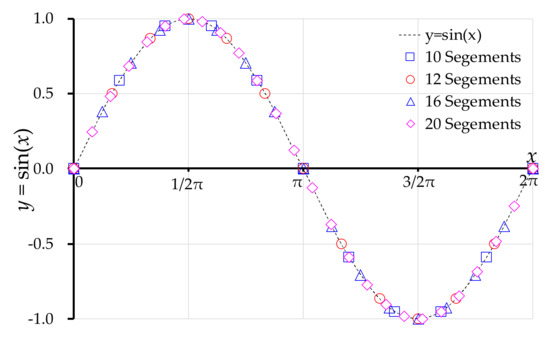 If we consider a simple wave function of y = sin(x), for example, Δt = 1/20 bpt would correspond to the 10 segments marked with a square in Figure 5. Obviously, Δt = 1/20 was too large to account for the wave superposition process; thus, a higher time resolution with a smaller timestep was required for the simulation. In this section, various timesteps Δt that correspond to 10 segments, 12 segments, 16 segments and 20 segments are studied for the same constant sound speed of a0 = 1200 m/s, and results are compared in order to find a suitable value of Δt to capture the PR phenomenon inside the spiral casing.