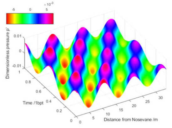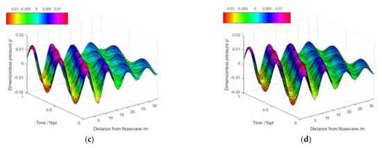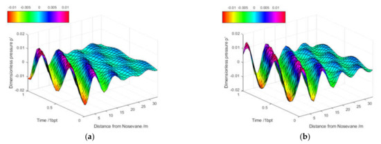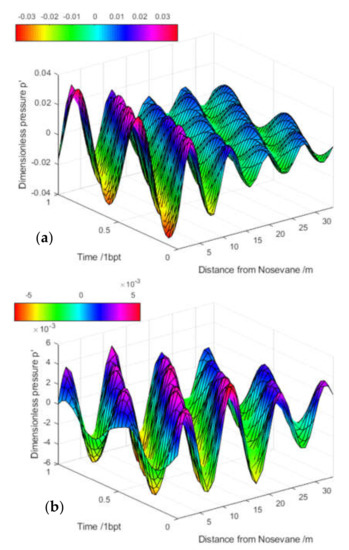 Figure 8 presents the results of the pressure waves within a period of one blade passage inside the spiral casing due to PR simulated with (a) a 10% lower sound speed (a0 = 1082 m/s) and (b) a 10% higher sound speed (a0 = 1320 m/s). A higher sound speed leads to a smaller ratio Lsp/(2λ) of the characteristic length of the spiral casing Lsp to two times the wave length of interest. According to Table 3, the ratio Lsp/(2λ) was reduced from 1.5 to 1.2 when the sound speed a0 was increased from 1082 m/s to 1320 m/s. In one attempt, the sound speed was further increased up to 1450 m/s, at which the Lsp/(2λ) = 1.1, and 1650 m/s, at which the Lsp/(2λ) = 1.0. The simulation for a0 = 1450 m/s was successful but failed for the a0 =1650 m/s case due to an unrealistic pressure behavior observed. In fact, the limit of the speed of sound in water was 1482 m/s at 20 °C, with a bulk modulus of N/m2. The case a0 = 1450 m/s was close to such a limit, but a0 = 1650 m/s exceeded the limit; thus, the pressure–density function could not behave properly, resulting in the failure of the simulation. Figure 9 presents the traveling pressure waves inside the spiral casing simulated with a0 = 1450 m/s.