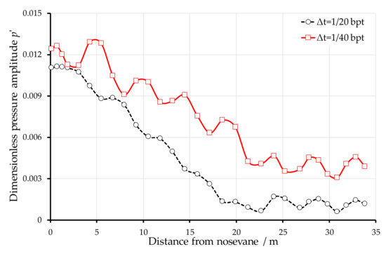 Figure 6 presents the results of pressure waves within a period of one blade passage inside the spiral casing due to PR simulated with four different timesteps for the case of a0 = 1200 m/s. As explained before, the results for Δt = 1/20 and 1/24 bpt showed lower resolutions, and those for Δt = 1/32 and 1/40 bpt showed higher resolutions. Figure 7 presents a comparison of the amplitudes at 2BPF for Δt = 1/20 and 1/40 bpt obtained from the FFT analysis, from which it can be seen that the simulation with a smaller timestep of Δt = 1/40 bpt produced higher amplitudes around the circumferential direction of the spiral casing than that with a larger timestep of Δt = 1/20 bpt. Therefore, to capture the PR phenomenon inside the spiral casing due to blade passage, Δt = 1/32 or 1/40 bpt are recommended as the appropriate timestep.