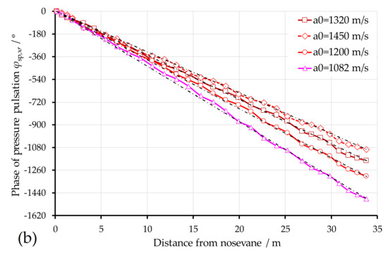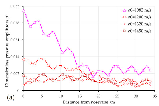 - On the other hand, by comparing a0 = 1320 m/s in Figure 8b and a0 = 1450 m/s in Figure 9 with a0 = 1200 m/s in Figure 6d, we can observe that increasing the sound speed a0 leads to the pressure waves traveling out of the spiral case faster, so the amplitudes along the spiral case would increase or be about constant over the spiral circumference. When the sound speed was increased, in our case, the ratio Lsp/(2λ) was closer to 1.0.