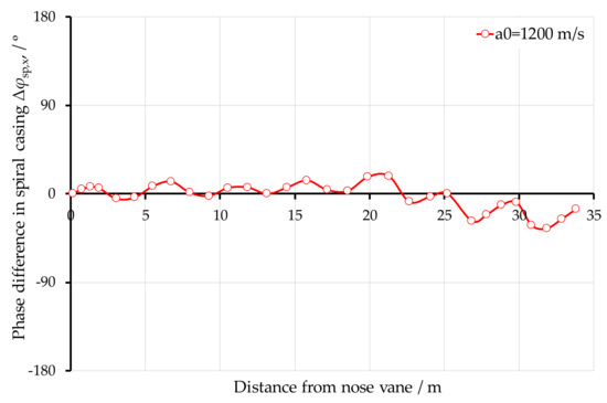 Figure 10a presents a detailed comparison of the dimensionless pressure amplitudes at 2BPF for different sound speeds. Taking the initial phase of the pressure signal at 2BPF monitored at the spiral casing end as zero, Figure 10b presents the comparison of the initial phase of the pressure signals at 2BPF at all the monitors in the spiral casing under different sound speeds. The following findings could be observed: