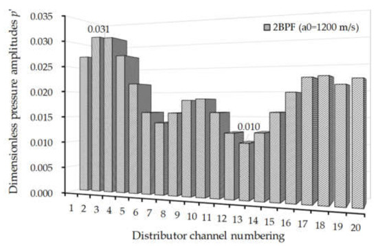 Amplitudes of the pressure fluctuations at 2BPF at the outlet of distributor channels.
