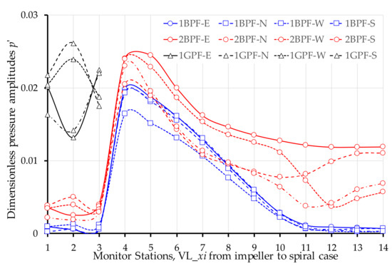 Although the RSI produces the source of PR, nevertheless, the pressure pulsation pattern over the circumference of the spiral formed by the mechanism of PR surrounds the rotating impeller through the distributor channels. Figure 13 presents the results of the amplitudes of the pressure fluctuations at the impeller upstream under several typical frequencies for a0 = 1200 m/s.