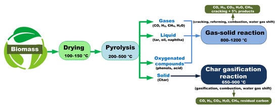 Biomass is a system with a rather complex structure. A group of processes, phase transformations, and chemical reactions in a condensed phase and gas medium proceed in biomass when it is heated. Below are equations describing the main processes and transformations, taking into account typical stages of biomass conversion [6,25,26]: drying, pyrolysis, and gasification (Figure 1). There are reactors in which most of these processes run simultaneously [6,25,26,27].