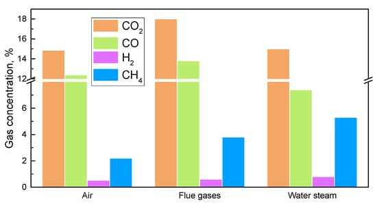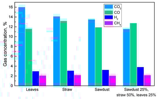 In this research, we also recorded the concentrations of the main components of the gas produced from the pyrolysis of different types of biomass and its mixtures. The experiments were conducted in a laboratory reactor with a temperature of 500 °C, with air as the pyrolysis medium. The fuel sample was introduced through an aperture on the reactor. After the sample was in the reactor, the aperture was closed hermetically with a valve, into which a modular gas analyzer probe was fitted. The composition of flue gases was recorded by the Test 1 gas analyzer (Boner-VT, Novosibirsk, Russia). The gas mixture went through the modular probe of the gas analyzer to its sensors, which determined the flue gas concentrations. A standard kit of the Test 1 gas analyzer includes six electrochemical sensors (O2, CO, NO, NO2, SO2, and H2S). It is additionally fitted with optical sensors for CO2 and CH4, as well as a polarographic sensor for H2. A detailed description of the experimental setup and the research method was presented in our previous studies [27]. The effect of the type of biomass on the gas composition was investigated.