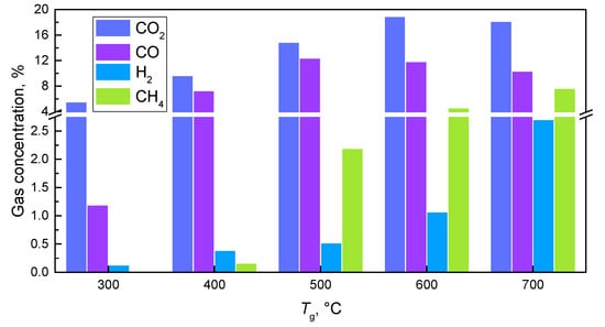 In this research, we also investigated the effect of thermal conditions on the concentrations of gaseous substances produced by pyrolysis. The temperature range under study was 300–700 °C. According to the data obtained, the production of CO2, H2, and CH4 rose with the pyrolysis temperature increase. The most considerable growth was recorded when the temperature exceeded 500 °C. This effect stems from faster semicoke pyrolysis and decomposition of volatiles. The average concentrations of H2 and CH4 increased by 60–95% and 40–97%, respectively. In the temperature range of 300–500 °C, the CO concentrations were found to rise too. However, when the temperature grew from 500 to 700 °C, the average concentrations of carbon monoxide fell by 4–17% (Figure 4). The latter can be attributed to enhanced reactions of carbon conversion and CO reduction. The established trend is in good agreement with other research findings, e.g., [81,82,83].
