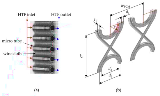 Figure 1a illustrates the wire cloth heat exchanger. The HTF flow through the tube is indicated. The PCM is located on the outside in contact with the wire cloth and tube (not shown in the figure). The complete structure is made of stainless steel, which would also allow the use of corrosive PCMs like salt hydrates. The wires are diffusion welded to the micro tubes, ensuring a good thermal contact. The small tube diameter allows to withstand high pressure, which is needed for example for high temperature storages for industrial processes including evaporation processes. Furthermore, the weaving process allows the manufacturing of large-scale heat exchanger elements, and also curved shapes are possible as the wire cloth is flexible [30]. Due to the high heat transfer area and low volume fraction of the wire, the heat exchanger can be used especially for applications with high power and storage density requirements. For the experimental set up, several wire cloth heat exchangers are arranged in parallel immersed in the PCM. Figure 1b shows a characteristic element of the wire cloth structure of two parallel heat exchangers. The geometrical parameters characterizing the heat exchanger are indicated in the figure.