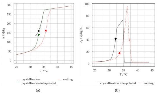 The enthalpy temperature relation is shown in Figure 3a. While for the melting, a continuous single phase change is detected for the crystallization, a second phase transition is visible at around 32 °C. As this supercooling is small in comparison to the overall phase transition from liquid to solid, it is neglected by interpolation as shown in the figure. This simplifies the modeling of the phase change transition process and allows to speed up the simulation while the storage capacity is preserved. The derived apparent heat capacity for melting and crystallization considering the interpolation is shown in Figure 3b.