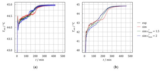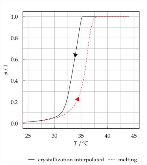 The transition of thermal conductivity from solid to liquid state is modeled with a transition function indicating the state of phase , whereby takes values between 0 to 1 for complete solid to complete liquid state. Commonly a smoothed step or ramp function is applied [14,34]. In this paper, we propose a transition function based on the phase change behavior determined by the DSC results. A similar approach was developed by Barz and Sommer in [35]. They used the results of different heating and cooling rates to extrapolate the behavior for a hypothetical zero heating and cooling rate. For the extrapolation, the apparent heat capacity needs to be approximated with a Weibull density function. The aim is to eliminate the rate dependency of the DSC results. In this contribution we already reduced the influence of the heating rate significantly by the heating rate test. Therefore, we directly use the DSC results. The determination of is based on the apparent heat capacity shown in Figure 3b. The latent part of the heat capacity is calculated by subtracting the sensible part from the total apparent heat capacity. Therefore, a linear interpolated baseline between solid and liquid state is. By integration of the latent part of the heat capacity and normalization to a maximum value of 1, the phase transition function is determined. The transition functions are shown in Figure 4.