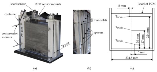 A lab scale prototype illustrated in Figure 5 was built. To observe the phase transition process, a transparent storage vessel (polymethylmethacrylate, PMMA) with a wall thickness of 12 mm is chosen. The inner dimensions of the vessel are 344.5 × 74 × 296 mm3. The size allows the integration of up to eight wire cloth heat exchangers. Each heat exchanger is connected to main inlet and outlet manifolds (not shown in figure) by hoses. The main manifolds are connected to the test facility (see Section 2.4.2). For a variation of the distance between the heat exchangers, spacers made of PMMA are placed between the heat exchanger manifolds (see Figure 5b). For the sizing of the container, the thermal expansion of the different components was considered. Thus, some additional volume is provided in the storage. To ensure a defined distance between the heat exchangers, they were pressed together by four compression mounts (two are marked in Figure 5a).