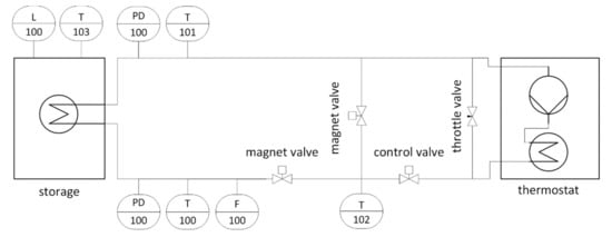 The storage system was characterized using a test facility at Fraunhofer ISE. The possible temperature range is −20 to 90 °C. The mass flow can be varied between 40 and 800 kg/h. A flow chart of the test facility is shown in Figure 6. Water ethylene glycol with a mixing ratio of 1:1 serves as HTF. The specific heat capacity was measured at Fraunhofer ISE by Q200 DSC (TA Instruments, New Castle, Delaware, USA) with an uncertainty of 5%. The temperature depended density, thermal conductivity and viscosity were taken from literature [42].