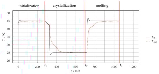 Inlet and outlet temperature for an experimental characterization during the three measurement periods initialization, crystallization and melting.